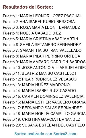 Lista de participantes: YOLANDA CABALLERO MATEOS, FELIPA VIEJO SANZ, JOSE MARIA MARTIN SAN SEGUNDO, OLGA SAMANIEGO MARTINEZ, MARIA ANGELES GARCIA GONZALEZ, YOLANDA BENITO DE CASTRO, BELEN ESCUDERO RUIZ, CRUZ TOQUERO ALONSO, CARLA JIAN CEREZO BLASCO, SANDRA FERNANDEZ MARTIN, PIEDAD ROJO MADRIGAL, TEODORA CUADRADO ANTOLIN, ROCIO VULCANO SORIANO, RAQUEL BARRIO GONZALEZ, BLAS TORREGROSA GARCIA, JOSE JERONIMO MARTINEZ RODRIGUEZ, SILVIA MANSO MANSO, MONICA FERNANDEZ PABLO, MARIA JESUS CORTIJO MAESO, AURORA PELAZ VARONA, CRISTINA PARDO GARCIA, VICTORIA LOPEZ DE ARBINA RODRIGUEZ, CARMEN ALBA ALONSO, MARIA LUISA CASTELL ARRANZ, PILAR LOPEZ AGUNDEZ, MARIA ANGELES LARA VILCHES, ANA ISABEL GARCIA YAGÜE, MARTY AZCONA MARTIN, MARIA EUGENIA VALDEZATE BOCOS, EVA MARIA VILLARREAL VALERO, ANA PEREZ BENITO, NEDKA NIKOLOVA DIMITROVA, MARIA LUISA CALVO MARTIN, MARIA ENCARNACIÓN PASTOR ENJUTO, MIRIAM MARRON HIERRO, CONSTANTINA QUIROGA ARRANZ, MARIA ROSA VEGAS HERRARTE, MARIA DEL CARMEN MITRE MORENO, ALFREDO HERRERO OVIEDO, LAURA GONZALEZ MARTIN, FRANCISCO JAVIER MEDINA HIDALGO, ALVARO SASTRE CUADRILLERO, ISABEL OLMOS MERIEL, CELESTINO ALTIDE MARTIN, JENIFER CUADRADO VAZQUEZ, MARIA JOSE LOMA MARTIN, ISABEL ESCRIBANO LARA, MARÍA JOSE ANTON GARCIA, JESUS MANUEL GONZALEZ ESPINILLA, PILAR REGLERO BOLADO, BERNARDO HERNANDEZ GONZALEZ, RAQUEL RODRIGUEZ JUAREZ, SUSANA PREVOST VELASCO, MONSERRAT JUAN POSA, MARIA LUISA GONZALEZ SORIANO, INES GOMEZ ESCUDERO, CARMEN LOPEZ MARCOS, MARIA JESUS GARRIDO BOMBIN, ROSA MARIA TARTAGLIA REDONDO, ALBA MENDEZ MITRE, ROSA GIL RUIZ DE ARBULO, SEGUNDO SANZ PASCUAL, SALOME DOSANTOS SALAS, VANESSA LUENGO BOROBIO, JENI ZUNILDA DAVILA BARRIENTOS, DELIA DE TORRE GONZALEZ, AGUSTINA CASADO MARTIN, CARMEN BORONDO PLAZA, CRISTINA VILLAVERDE ROMON, ANGELA PRIETO LOPEZ, ANGELICA RUIZ ERICE, JESUS JAVIER OLMEDO MEDINA, BEGOÑA BUENA TADEO, LORENA GARCIA GARCIA, MARIA DEL MAR PAJARES GOMEZ, MARTA TOVAR VILLAR, MONICA TEJEDA ESCRIBANO, MARIA DE LAS MERCEDES GONZALEZ GONZALEZ, TALFONSO DEL BLANCO RODRIGUEZ, ANGEL CARDEÑOSA DOMINGO, LUCIA CARBALLO BALOIRA, SILVIA TEJEDOR CANTALAPIEDRA, ANGELA MARCOS AYUSO, ALMUDENA FUERTES PRIETO, ANDREA LUCIA DE OLIVEIRA PEREIRA, MARIAN GASCON VACA, ANGELES BORONDO PLAZA, LAURA SIMON SIMON, BEGOÑA SIMON MARTINEZ, ANTONIO DE LA PUENTE GARCIA, LOLA BLANCO SANCHEZ, ELENA SANZ RODRIGO, REBECA LEO CANO, CARMEN MARTIN DOMINGUEZ, ROCIO FERNANDEZ VAZ, ARANTXA PRIETO FERNANDEZ, JOSEFA GÜILES MUÑOZ, MARGARITA ALVAREZ ALVAREZ, MONTSERRAT MARCOS DE LOS RIOS, MONICA GUTIERREZ FURONES, ESTHER RIESGO GARCIA, ROSA LUZAN GONZALEZ, LUCIA SAN JOSE DIENTE, ISABEL SALAZAR RODRIGUEZ, MARIA JOSEFA SANTANA IGLESIAS, PATRICIA SOBRINO DIAZ, BORJA SANTIRSO OLIVAR, LAURA SANCHEZ DOMINGUEZ, MARIA VICTORIA SANCHEZ, MARIA JESUS BERNARDO GRANDE, ANA MARIA MARTIN CASADO, MARTA POSADA CALVO, ANA SOLEDAD SANTOS LOPEZ, BEATRIZ LORENZO RODRIGUEZ, SERGIO DE LA TORRE DE JUAN, MARIA VIDALES MIGUELEZ, MARIA CARMEN HIERRO JIMENEZ, MARIA DOLORES BARRIOS LOZANO, TANIA CORTES VELASCO, MELANIE ARIANE WAGNER GRANDA, LAURA HIDALGO LABAJO, MARIA DEL MAR FERNANDEZ PEON, IRIS PEÑA FRANCO, ROSA DE VEGA CASADO, MARIA ALMUDENA ZARZUELO RODRIGUEZ, MARIA HENAR SANZ BACHILLER, NOELIA GONZALEZ MORENO, MARIA PAZ DOMINGUEZ FERRERO, ANA MARIA CRESPO MARTIN, MARIA TERESA HERNANDEZ MARTINEZ, VICTORIA ISABEL BACHILLER GARCIA, LORENA MOLINA SOBRADILLO, MARIA VILLEGAS QUESADA, MARIA ROCIO GARCIA GARCIA, ESTEFANIA VALENCIA PRIETO, MARIA ESTHER DE VEGA MIELGO, ANA ISABEL DE VEGA MIELGO, MARTA MOLINA GONZALEZ, ADRIANA ELVIRA PABLOS PEDREÑO, INES CASTRO MUÑOZ, ANA PATRICIA FRAILE PRIETO, MARIA TERESA FUENTE ROMERO, LAURA BLANCO SANCHA.