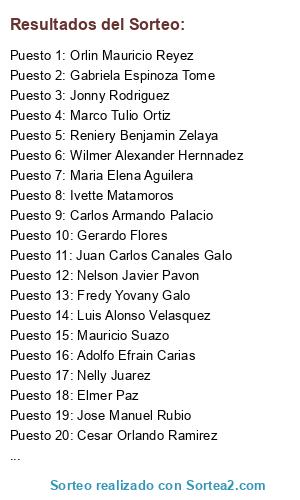 Lista de participantes: Alfredo Alcantara, Reinaldo Sierra, Alfredo Ramos, Nelson Javier Pavon, Gerardo Flores, Wendy Karina Garcia, Eugenia Varela, Cesar Maldonado, Maria Elena Aguilera, Milixa Jaqueline Montoya, Ana Lucia Zavala, Darwin Matamoros, Oscar Lopez, Marco Tulio Ortiz, Xenia Rodas, Fernando Jose Hernandez, Arely Yamilerh Pozo, Adolfo Efrain Carias, Fany Bulnes, Kenny Padilla, Manuel Sevilla, Anthony Josue Ampie, Dennis Evelio Zuniga Nieto, Nelly Juarez, Jose Vaquedano Mendoza, Edson Ronaldo Mencia, Jose Santos Mejia, Carlos Armando Palacio, Emily Nicolle Mejia, Cesar Orlando Ramirez, Queran Daniel Perez, Orlin Mauricio Reyez, Hector Rodriguez, Elmer Paz, Fredy Yovany Galo, Mauricio Suazo, Xiomara Espinoza, Mario Saul Cruz, Angel Rodrigez, Luis Alonso Velasquez, Juan Carlos Canales Galo, Joel Antonio Flores, Gabriela Espinoza Tome, Gabriela Alejandra Rivera, Leonel Alexis Peña, Ivette Matamoros, Reniery Benjamin Zelaya, Dania Mariela Ochoa, Denia Salvador, Jonny Rodriguez, Lesbia Guillen, Acsa Alvarado, Yovany Joel Zelaya, Mayra Xochill Funez, Gelbert Hophinson, Rosangela Arely Velasquez, Edilson David Discua, Enory Nicolee Andino, Cesar Augusto Pavon, Wilmer Alexander Hernnadez, Jose Manuel Rubio, Levi Nuñez, Belky Licona.