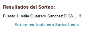 Lista de participantes: Isabel Crespo Salinas Pero si sale el que tengo termina en 36 ayudaría a mucha gente necesitada, Yolanda Baldovi Sánchez Suerte para todas y todos, Mir Mirella 19, Isabel Crespo Salinas 37., Lorena Martin Porras 25, Mari Diaz Jimenez En 40, Alicia Simbaña Muzo Alicia simbaña 79, Elizabeth Cardona 7 y 3, Carmen Elich Jimenez 15, Juan Lu 17, Soledad Torrijos 21, Rocío Menéndez Vera 25, Leonor Checa Gamboa 55, Alicia Gonzalez 47, Ana Ramírez 18, Maria Ordoñez Lopez 36, Antoyemi Fernandez Gonzalez 55, Raúl Sanromán 13, Javier Garcia 13, Consu Lizcano 64, Javier Almendros Muñoz 17, Elisabet Garcia Ordoñez 34, Ana Fernandez 02, Inma Orellana Jordán 89, Jesus Ditado Martinez 42, Maria Del Mar Gonzalez 24, AaronyRocio Gonzalez 15, Jony González González 10, Arley Aponte Quintero 53, ManuyAlicia Fernandez 20, Zara Andújar Sojo 21, Isabel Barras Palomino 24, Teresa Diaz Carrizo 48, Riansares Morales Parraga 27, Jesús Del Burgo 44, Alicia Martinez 28, Cristina Morena Morena 13 56, Brenda Sant 22 y 30 Israel Sánchez Soro Susi Repairsat a ver si toca jaja, Mariajose Ramirezpoyatos 69, Cristina Morena Morena 13, Sonia Zapata 15, Rocio Magro Jimenez 73, Ch Andres 51, Mayte Magro Jimenez 19, Maria Eujenia Gil Montilla 08, Mari Garcia El 2, Sonia Muñoz 23, David Gonzalez Coca 07, Jose Pablo Castellanos Jimenez 71, Andres Pineda 72, Susy Gómez 58, Laura Serrano Alvarez 33 Miriam Mtnez Beatriz Guerrero Duque, Valle Guerrero Sanchez El 68....!!!, Daniel Diaz Moron 14 Sonia Zapata Miguel Pulido Valencia, Lidiia Espada 06 Celia Espada Torres Joaquín García Martínez, Miguel Pulido Valencia 13 Daniel Diaz Moron !, Maria Jesus Ruiz Lazaro 68 Pedro Lopez Ruiz y Xavi Lopez Ruiz, Ana Razola Hurtado 45 Angel Yunta Rodriguez Joni Razola, Cristina Muñoz 10 Amelia Serrano Adrada,Isabel Castejon Adrada,Teresa PT, Yolanda Ruiz Verdugo 17 Noemi Ruiz Almudena Jimenez Ruiz, Mary Torremocha Navas 16 Victor González Platas Jesus Torremocha Navas, Alexandra Gomez Rubio 79 Ascension Rubio Lucía Serrano Álvarez, Lucía Serrano Álvarez 16 Laura Serrano Alvarez Veronica Garcia Martinez, Vanessa Olivas Bartolome El 11. Sandra Olivas Bartolome y Maribel Olivas Bartolome, Lorena Rodriguez Alvarez Cristina Martinez y Susana Rodriguez Alvarez 73, Leticia Olivas Lopez 35 Manuel Hontana Rubiato Nuria Martinez Manzanares, Inmaculada Garcia Carranza 30 Raquel Lopez Toñi Carranza, Juan Carlos Glez Garrido 12 , Nuria Martinez Manzanares 03.