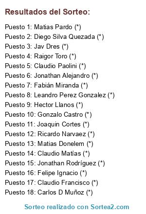 Lista de participantes: Joaquin Cortes (*), Matias Pardo (*), Jonathan Alejandro (*), Felipe Ignacio (*), Ricardo Narvaez (*), Claudio Paolini (*), Matias Donelem (*), Fabián Miranda (*), Carlos D Muñoz (*), Jonathan Rodríguez (*), Raigor Toro (*), Gonzalo Castro (*), Hector Llanos (*), Leandro Perez Gonzalez (*), Jav Dres (*), Diego Silva Quezada (*), Claudio Matías (*), Claudio Francisco (*).
