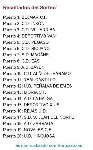 Lista de participantes: A.D. BAYÉN, A.D. LA BALSA, A.D. ZÁRRAGA, BÉLMAR C.F., C.D. ALÑI DEL PÁRAMO, C.D. EAS, C.D. INXÓN, C.D. PEGASO, C.D. RIOJANO, C.D. VILLARRIBA, DEPORTIVO VAN, DEPORTIVO XÍUS, MORIA C.F., NOVALES C.F., REAL CASTILLO, REJAS U.D., S.D. MACÁNS, S.D. S. JUAN DEL NORTE, U.D. HINOJOSA, U.D. PEÑALVA DE EMÉS.