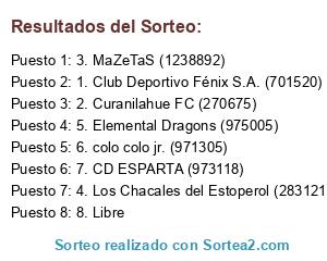 Lista de participantes: 1. Club Deportivo Fénix S.A. (701520), 2. Curanilahue FC (270675), 3. MaZeTaS (1238892), 4. Los Chacales del Estoperol (283121), 5. Elemental Dragons (975005), 6. colo colo jr. (971305), 7. CD ESPARTA (973118), 8. Libre.