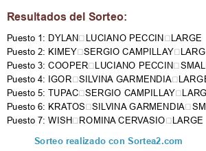 Lista de participantes: TUPAC SERGIO CAMPILLAY LARGE, KIMEY SERGIO CAMPILLAY LARGE, DYLAN LUCIANO PECCIN LARGE, WISH ROMINA CERVASIO LARGE, IGOR SILVINA GARMENDIA LARGE, COOPER LUCIANO PECCIN SMALL, KRATOS SILVINA GARMENDIA SMALL.