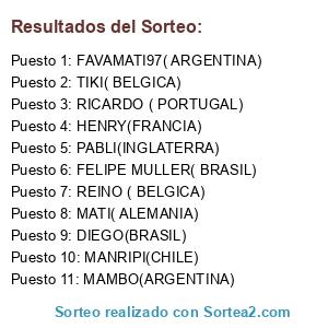 Lista de participantes: REINO ( BELGICA), FAVAMATI97( ARGENTINA), FELIPE MULLER( BRASIL), MANRIPI(CHILE), MATI( ALEMANIA), TIKI( BELGICA), RICARDO ( PORTUGAL), PABLI(INGLATERRA), DIEGO(BRASIL), MAMBO(ARGENTINA), HENRY(FRANCIA).