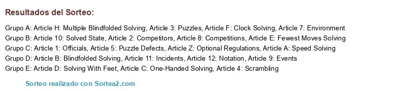 Lista de participantes: Article 1: Officials, Article 2: Competitors, Article 3: Puzzles, Article 4: Scrambling, Article 5: Puzzle Defects, Article 7: Environment, Article 8: Competitions, Article 9: Events, Article 10: Solved State, Article 11: Incidents, Article 12: Notation, Article A: Speed Solving, Article B: Blindfolded Solving, Article C: One-Handed Solving, Article D: Solving With Feet, Article E: Fewest Moves Solving, Article F: Clock Solving, Article H: Multiple Blindfolded Solving, Article Z: Optional Regulations.