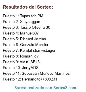 Lista de participantes: Xinyanggan, Fernandito77898231, Roman_gv, Gonzalo Mendia, Tapas fcb PM, Richard Jordan, Tassio Oliveira 30, Kendal sbanwstaiger, AlainLBB13, JerryADS, Manuel807, Sebastián Muñeco Martínez.