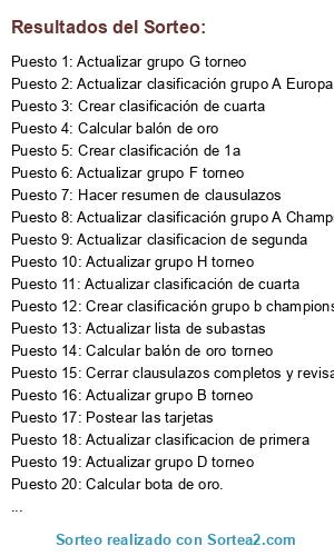 Lista de participantes: Actualizar clasificacion de primera, Actualizar clasificacion de segunda, Actualizar clasificacion de tercera, Actualizar clasificación de cuarta, Actualizar clasificación grupo A Champions, Actualizar clasificación grupo B champions, Actualizar clasificación grupo A Europa League, Actualizar clasificación grupo B Europa league, Actualizar grupo A torneo, Actualizar grupo B torneo, Actualizar grupo C torneo, Actualizar grupo D torneo, Actualizar grupo E torneo, Actualizar grupo F torneo, Actualizar grupo G torneo, Actualizar grupo H torneo, Postear las tarjetas, Abrir y unificar ojeador, Abrir post de mercado de fichajes y hacer resumen, Actualizar lista de subastas, Abrir post de descartes, Hacer resumen de clausulazos, Calcular balón de oro, Calcular bota de oro., Calcular mvp torneo, Calcular balón de oro torneo, Crear clasificación de 1a, Crear clasificación de segunda, Crear clasificación de tercera, Crear clasificación de cuarta, Crear clasificación grupo a champions, Crear clasificación grupo b champions, Crear clasificación grupo A Europa league, Crear clasificacion grupo B Europa league, Cerrar clausulazos completos y revisar clausulazos, Ordenar equipos en el foro.