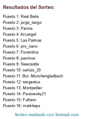 Lista de participantes: sergestus, serluis_20, markiteps, jorge_tango, pro_nano, Arcangel, Paulowsky21, juanicoo, Real Betis, Las Palmas, Newcastle, Fulham, Parma, Fiorentina, Montpellier, Bor. Monchengladbach.