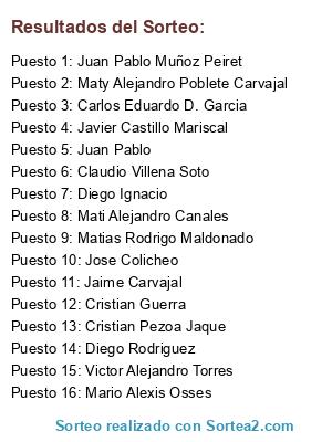 Lista de participantes: Carlos Eduardo D. Garcia, Jaime Carvajal, Cristian Pezoa Jaque, Mario Alexis Osses, Mati Alejandro Canales, Diego Rodriguez, Jose Colicheo, Cristian Guerra, Javier Castillo Mariscal, Claudio Villena Soto, Juan Pablo Muñoz Peiret, Maty Alejandro Poblete Carvajal, Matias Rodrigo Maldonado, Juan Pablo, Diego Ignacio, Victor Alejandro Torres.