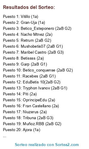 Lista de participantes: Mendaza (2a), Racebes (2aB G1), Nacho Mtnez (2a), ElCapa (2a), Mushobetis07 (2aB G1), Garp (2aB G1), Tribuna (2aB G3), Gran-Uja (1a), Vitillo (1a), Maribel Castro (2aB G3), OprincipeEdu (2a), Ajora (1a), Lembo7 (1a), Tryphon Ivanov (2aB G1), Luison58 (2aB G3), AleRodri_94 (2aB G3), Gaston_Casillas (2aB G3), Er Dehfase (2aB G3), Senver (2aB G1), Niuzerus (2a), EduBetis 10(2aB G2), Betico_Norte (2aB G1), Piti (2a), Muñoz.RBB (2aB G2), Teskiya (2aB G3), Fran Castellano (2a), Betico_conquense (2aB G2), Betico_Esteponero (2aB G2), Retrum (2aB G2), Betissss (2a).
