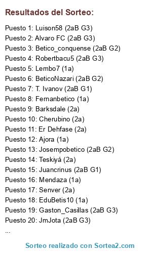 Lista de participantes: Lembo7 (1a), Josempobetico (2aB G2), Tribuna (2aB G2), Mendaza (1a), Betico_conquense (2aB G2), Ajora (1a), Alvaro FC (2aB G3), Robertbacu5 (2aB G3), T. Ivanov (2aB G1), BeticoNazari (2aB G2), EduBetis10 (1a), Senver (2a), Er Dehfase (2a), Fran Castelano (2aB G1), Luison58 (2aB G3), Gaston_Casillas (2aB G3), Teskiyá (2a), @LaPreviaFantasy (2a), Nacho Mtnez (2a), JmJota (2aB G3), Juancrinus (2aB G1), Cherubino (2a), Barksdale (2a), Fernanbetico (1a).