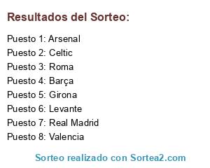 Lista de participantes: Girona, Real Madrid, Valencia, Arsenal, Levante, Roma, Barça, Celtic.