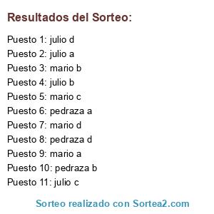 Lista de participantes: mario a, mario b, mario c, mario d, pedraza a, pedraza b, pedraza c, pedraza d, julio a, julio b, julio c, julio d.