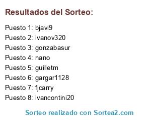 Lista de participantes: ivanov320, fjcarry, nano, bjavi9, gonzabasur, guilletm, gargar1128, ivancontini20.
