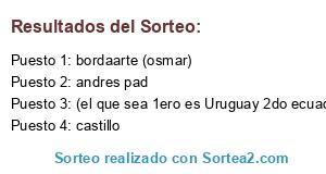 Lista de participantes: andres pad, castillo, bordaarte (osmar), (el que sea 1ero es Uruguay 2do ecuador 3ero bulgaria).