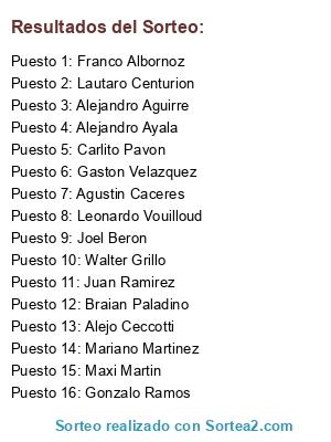 Lista de participantes: Alejandro Aguirre, Agustin Caceres, Mariano Martinez, Franco Albornoz, Alejandro Ayala, Maxi Martin, Lautaro Centurion, Gaston Velazquez, Braian Paladino, Juan Ramirez, Carlito Pavon, Joel Beron, Walter Grillo, Gonzalo Ramos, Leonardo Vouilloud, Alejo Ceccotti.