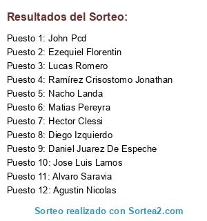 Lista de participantes: Ramírez Crisostomo Jonathan, Diego Izquierdo, Matias Pereyra, John Pcd, Nacho Landa, Daniel Juarez De Espeche, Agustin Nicolas, Lucas Romero, Jose Luis Lamos, Hector Clessi, Ezequiel Florentin, Alvaro Saravia.