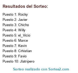 Lista de participantes: Marce, Javier, Crhistian, Chicho, Jlatripero, Kevin, Rocky, Favio, el_Vicio, Willy.