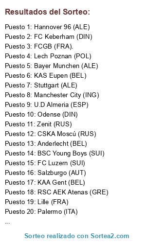 Lista de participantes: Juventus (ITA), Manchester City (ING), Salzburgo (AUT), Lech Poznan (POL), Atlético de Madrid (ESP), Bayer Leverkusen (ALE), Rosenborg (NOR), Dinamos Moscu (rus), Sporting Lisboa (POR), Lille (FRA), KAS Eupen (BEL), KAA Gent (BEL), Villarreal (ESP), Club Brugge (BEL), U.D Almeria (ESP), FCGB (FRA)., AZ Alkmaar (HOL), Academia (POR), Bayer Munchen (ALE), Hannover 96 (ALE), CSKA Moscú (RUS), Palermo (ITA), Besiktas JK (TUR), FC Luzern (SUI), Zenit (RUS), Anderlecht (BEL), RSC AEK Atenas (GRE), FC Keberham (DIN), Stuttgart (ALE), Getafe (ESP), Odense (DIN), BSC Young Boys (SUI).