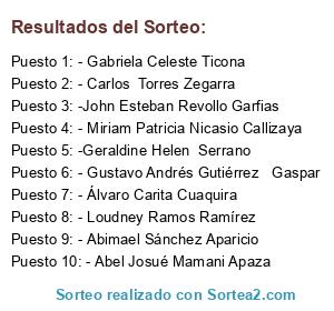 Lista de participantes: -Geraldine Helen Serrano, - Abimael Sánchez Aparicio, - Gustavo Andrés Gutiérrez Gaspar, - Abel Josué Mamani Apaza, - Álvaro Carita Cuaquira, - Loudney Ramos Ramírez, - Gabriela Celeste Ticona, - Carlos Torres Zegarra, - Miriam Patricia Nicasio Callizaya, -John Esteban Revollo Garfias.