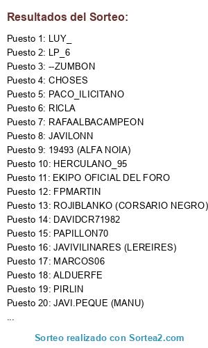 Lista de participantes: JAVIVILINARES (LEREIRES), FPMARTIN, RAFAALBACAMPEON, REAL-SOCIEDAD, 19493 (ALFA NOIA), JAVILONN, HERCULANO_95, JAVI.PEQUE (MANU), INAUSKI, PACO_ILICITANO, TITOROBERT69, ALDUERFE, JOAGONCOR, PAPILLON70, PIRLIN, LP_6, MARCOS06, ROJIBLANKO (CORSARIO NEGRO), RICLA, XESCO, CHOSES, DAVIDCR71982, --ZUMBON, PUTXETAZO, LUY_, EKIPO OFICIAL DEL FORO.
