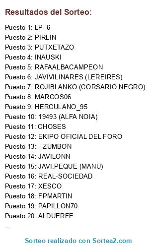 Lista de participantes: JAVIVILINARES (LEREIRES), FPMARTIN, RAFAALBACAMPEON, REAL-SOCIEDAD, 19493 (ALFA NOIA), JAVILONN, HERCULANO_95, JAVI.PEQUE (MANU), INAUSKI, PACO_ILICITANO, TITOROBERT69, ALDUERFE, JOAGONCOR, PAPILLON70, PIRLIN, LP_6, MARCOS06, ROJIBLANKO (CORSARIO NEGRO), RICLA, XESCO, CHOSES, DAVIDCR71982, --ZUMBON, PUTXETAZO, LUY_, EKIPO OFICIAL DEL FORO.