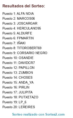 Lista de participantes: HERCULANO95, FPMARTIN, DAVIDCR7, ANDA_YA, ALFA NOIA, ZUMBON, ALDURFE, IÑAKI, JULIPITA, LP_6, PUTXETAZO, TITOROBERT69, PIRLIN, OSANDIE, PAPILLON, CORSARIO NEGRO, CHOSES, MARCOS06, JOSCARGAR, LEREIRES.