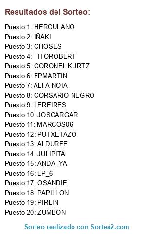 Lista de participantes: OSANDIE, HERCULANO, CORSARIO NEGRO, LEREIRES, CORONEL KURTZ, TITOROBERT, JOSCARGAR, IÑAKI, PUTXETAZO, FPMARTIN, JULIPITA, ALDURFE, LP_6, CHOSES, PIRLIN, PAPILLON, ANDA_YA, MARCOS06, ALFA NOIA, ZUMBON.