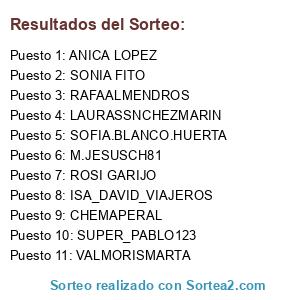Lista de participantes: VALMORISMARTA, ISA_DAVID_VIAJEROS, ANICA LOPEZ, ROSI GARIJO, CHEMAPERAL, SONIA FITO, LAURASSNCHEZMARIN, SOFIA.BLANCO.HUERTA, SUPER_PABLO123, M.JESUSCH81, RAFAALMENDROS.