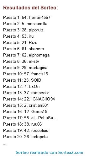 Lista de participantes: 1. cipotti, 2. cristian501, 3. juandy, 4. AMATINHO2, 5. mescamilla, 6. JAS_73, 7. ExOn, 8. angelcop83, 9. Hybrid, 10. sefirottt, 11. rubeen, 12. Gores19, 13. kaisser, 14. toor89, 15. Sk0rpio, 16. rafana, 17. lucensinho, 18. davidiho10, 19. Sete, 20. hintoni, 21. Rizo, 22. IGNACIIO94, 23. SOID, 24. blackdeevil, 25. gutistas, 26. fortopeta, 27. assalito, 28. piporuiz, 29. martagina, 30. sheraton159, 31. ZeQuI, 32. JosePolo, 33. lolazo, 34. CaTa8, 35. loscañoneros, 36. el-stv, 37. rompedor, 38. ruu06, 39. DomiN, 40. YoSe7007, 41. Perdy_trs, 42. roqueluis, 43. MR7, 44. MovillaFr85, 45. Ferrer4, 46. Onecrack, 47. Stoned1, 48. Pichichi Neng, 49. JGazkez, 50. luigi carras 89, 51. Serghy_10, 52. alicate, 53. iru, 54. Ferrari4567, 55. selinichev, 56. osvaldiito, 57. francis15, 58. eL_PeLuSa_, 59. dani_cdsf, 60. a.fuentes, 61. shanero, 62. elphomega, 63. CA_granmago, 64. richisanfer.