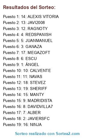 Lista de participantes: 1: ÁNGEL, 2: JAVIERSFC, 3: GANAZA, 4: REDSPANISH, 5: JUANMANUEL, 6: ESCU, 7: ALBER, 8: DAVIDVILLA7, 9: MADRIDISTA, 10: CALVENTE, 11: NAVAS, 12. RAGNOTY, 13: JAVI2008, 14: ALEXIS VITORIA, 15: MANTY, 16: NINJA, 17: MEGAZOFT, 18: STEVEZ, 19: SHERIFF.