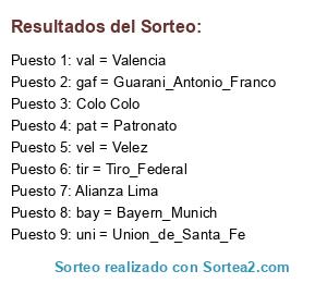 Lista de participantes: riv = River, lan = Lanus, bel = Belgrano, col = Colon, Ars = Arsenal, arg = Argentinos_jrs, gim = Gimnasia_LP, gyj = Gimnasia_de_Jujuy, tig = Tigre, ind = Independiente, int = Instituto, pat = Patronato, san = San_Lorenzo, uni = Union_de_Santa_Fe, vel = Velez, all = All_Boys, alm = Almirante_Brown, atl = Atletico_Tucuman, ald = Aldosivi, bou = Boca_Unidos, cen = Rosario_Central, inr = Independiente_Rivadavia, itu = Ituzaingo, mer = Deportivo_Merlo, new = Newells, god = Godoy_Cruz, hur = Huracan, dha = Douglas_Haig, vsa = Villa_San_Carlos, tem = Temperley, tir = Tiro_Federal, qui = Quilmes, sar = Sarmiento_de_Junin, cha = Chacarita, fer = Ferro, ben = Benfica_FC, bay = Bayern_Munich, nap = Napoli, oll = Olympique_Lyonnais, pan = Panathinaikos, psg = París_Saint_Germain, por = Porto_FC, wbr = Werder_Bremen, arl = Arsenal_Inglaterra, bor = Borussia_Dortmund, che = Chelsea, csk = CSKA_Moscow, imi = Inter_Milan, juv = Juventus, liv = Liverpool, mau = Manchester_United, val = Valencia, gal = Galatasaray, atm = Atletico_Madrid, aja = Ajax, AHL = AL_AHLY, AIN = AL_AIN, ULS = ULSAN_HYUNDAI, SHA = SHANGAI_SHENHUA, FRE = SAN_FRECCE, ESP = ESPERANCE_SPORTIVE, CAS = WYDAD_CASABLANCA, BRI = BRISBANE_ROAR, America de Cali, Botafogo, Colo Colo, Cruzeiro, Tolima, Deportivo Quito, Fluminense, Gremio, Internacional de PA, Nacional Montevideo, Olimpia, Palmeiras, Pumas UNAM, Sao Paulo, Vasco da Gama, Alianza Lima, America Mexico, Nacional Medellin, Barcelona Ecuador, Bolivar, Cerro Porteño, Corinthians, Cruz Azul, Danubio, Dep.Tachira, Juan Aurich, Libertad Paraguay, Liga de Quito, LA Galaxy, Monterrey, NY Red Bulls, SO Cristal, U Catolica, U de Chile, Universitario de Lima, gaf = Guarani_Antonio_Franco, sre = Sarmiento_de_Resistencia, des = Deportivo_Español, pla = Platense, man = Mandiyu_de_Corrientes, nor = Crucero_del_Norte, atr = Atletico_Rafaela, chi = Nueva_Chicago, alv = Alvarado, oli = Olimpo, smt = San_Martin_de_Tucuman, cai = C.A.I., tal = Talleres_de_Cordoba, sbe = Sportivo_Belgrano_SF, eba = Estudiantes_de_BsAs, tel = San_Telmo, att = Atlanta, bro = Brown_de_Adrogue, ssj = San_Martin_de_SJ, dks = Sp_Dock_Sud.