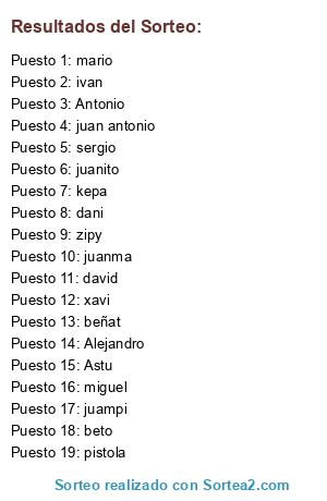 Lista de participantes: Alejandro, Antonio, Astu, beto, beñat, dani, david, juan antonio, juanito, juanma, kepa, mario, miguel, pistola, sergio, xavi, zipy, ivan, juampi.