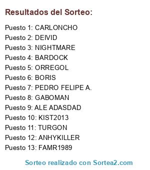 Lista de participantes: ORREGOL, BORIS, ANHYKILLER, FAMR1989, ALE ADASDAD, BARDOCK, CARLONCHO, DEIVID, GABOMAN, NIGHTMARE, PEDRO FELIPE A., TURGON, KIST2013, .