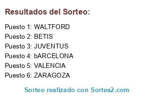 Lista de participantes: bARCELONA, JUVENTUS, WALTFORD, BETIS, VALENCIA, ZARAGOZA.