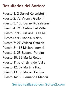 Lista de participantes: 1Loana Venezuela, 2 Daniel Kolselstein, 3 Marisa Mac, 4 Maria Fernanda Iroume, 5 Daniel Kolselstein, 6 Cristina del Valle, 7 Luisiana Claisse, 8 Loana Venezuela, 9 Graciela Martin, 10 Pablo Rojas, 11 María Fernanda Iruomé, 12 Susana Pereira, 13 Daniel Kolselstein, 14 María Fernanda Iroume, 15 Loana Venezuela, 16 Boris Tassi, 17 Viviana Ostoich, 18 Maria Fernanda Iroume, 19 Martina Paz, 20 Hilda Bogao, 21 Cristina del Valle, 22 Fernanda Campos, 23 María Fernanda Iruomé, 24 Fernanda Mandri, 25 Susana Pereira, 26 Marisa Mac, 27 Viviana Ostoich, 28 Fernanda Campos, 29 Fernanda Mandri, 30 Susana Pereira, 31 Marisa Mac, 32 Boris Tassi, 33 Tamara Vega, 35 Erica Daniela, 36 Maiten Lenmai, 40 Graciela Martin, 47 Tamara Vega, 48 Erica Daniela, 54 Tamara Vega, 58 María Rotea, 62 Martina Paz, 63 Erica Daniela, 64 Gise Otamendi, 65 Maiten Lenmai, 66 Graciela Martin, 68 Gise Otamendi, 69 Boris Tassi, 71 Virginia Galloni, 72 Virginia Galloni, 73 Virginia Galloni, 76 Cristina del Valle, 79 María Rotea, 81 Fernanda Campos, 83 Maiten Lenmai, 86 Fernanda Mandri, 87 Martina Paz, 88 María Rotea, 89 Luisiana Claisse, 95 Luisiana Claisse, 99 Gise Otamendi, 101 Fernanda Campos, 102 Maria Rotea, 103 Daniel Kolselstein, 104 Graciela Martin, 105 Susana Pereira, 106 Erica Daniela, 107 Loana Venezuela, 108 Marisa Mac, 109 María Fernanda Iroume, 110 Fernanda Mandri, 111 Tamara Vega, 112 Martina Paz, 113 Virginia Galloni, 114 Boris Tassi, 115 Gise Otamendi, 116 Luisiana Claisse, 117 Cristina del Valle, 118 Mailen Lenmai.