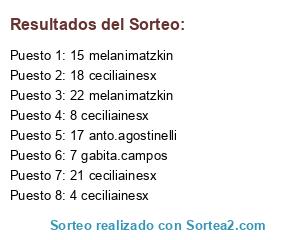 Lista de participantes: 4 ceciliainesx, 7 gabita.campos, 8 ceciliainesx, 15 melanimatzkin, 17 anto.agostinelli, 18 ceciliainesx, 21 ceciliainesx, 22 melanimatzkin.