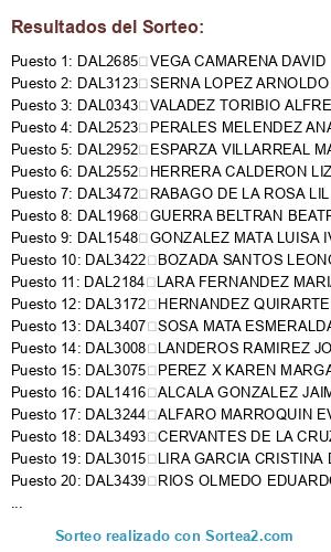 Lista de participantes: DAL0028 ORTEGA PEREZ DOMINGO, DAL0152 RAMIREZ TELLO MUÑOZ JOSE HILMAR, DAL0343 VALADEZ TORIBIO ALFREDO, DAL0364 HERNANDEZ CERVANTES ERIKA BERENICE, DAL0428 DIAZ MUNGUIA RAQUEL, DAL0452 REYNOSO RUIZ ALMA DELIA, DAL0626 ORTIZ NERY LILIA I, DAL0921 JIMENEZ VILLALOBOS LUZ MARIA, DAL1005 TOLENTINO QUEZADA CLAUDIA NAYELI, DAL1127 DIAZ GAMEZ JUAN FRANCISCO, DAL1275 CASTRO PALOMINO OSCAR, DAL1412 CANTERO LOPEZ CARLA JANETT, DAL1416 ALCALA GONZALEZ JAIME SALVADOR, DAL1540 AVALOS LOZA CYNTHIA ALELHI, DAL1548 GONZALEZ MATA LUISA IVETTE, DAL1566 MENDOZA PEREZ ALEJANDRA GUADALUPE, DAL1618 RODRIGUEZ HUERTA MARISELA, DAL1644 GUTIERREZ CORREA ALINA, DAL1890 ORNELAS PACHECO JUDITH GUADALUPE, DAL1962 MONTES CHAVEZ BANESA, DAL1968 GUERRA BELTRAN BEATRIZ ADRIANA, DAL1994 RAMIREZ CORTES CARLO JOSUE, DAL2069 HERNANDEZ RIVERA ALDAIR AARON, DAL2071 AGUILA PADILLA STEPHANIA GUADALUPE, DAL2102 ACOSTA RENTERIA JOSE LUIS, DAL2143 CARDENAS JIMENEZ LUIS MANUEL, DAL2184 LARA FERNANDEZ MARIA DEL SOCORRO, DAL2234 VAZQUEZ RUIZ JOEL ANTONIO, DAL2237 LOPEZ VILLANUEVA GLORIA ISABEL, DAL2255 BAILON OLIDEN MARIA ELISA, DAL2274 GUZMAN VARGAS DAVID, DAL2297 CONTRERAS SANCHEZ NANCY LIZBETH, DAL2313 MOLINA SANCHEZ MONSERRAT DEL CARMEN, DAL2316 DE LA CRUZ TARAZON ZULMA ELIZABETH, DAL2333 SANCHEZ MARTINEZ MARIA JOSE, DAL2406 REGALADO SORIANO YOKO ELIZABETH, DAL2429 ZAMORA VARGAS MARITZA ANDREA, DAL2523 PERALES MELENDEZ ANALUISA, DAL2543 FLORES ELIAS JOSE DE JESUS, DAL2563 GARCIA DE SANTOS MARIA GUADALUPE DE JESUS, DAL2593 CHAVEZ TOVAR LIDIA JUDITH, DAL2628 CORTES RAMOS ANGELICA YAZMIN, DAL2671 OTERO ZAVALA GABRIELA JENIFER, DAL2685 VEGA CAMARENA DAVID, DAL2696 MARTINEZ PAJAR CARLOS ANTONIO, DAL2705 RUIZ ROMERO ALEJANDRA, DAL2710 QUIROZ QUIROZ LUIS DAVID, DAL2725 MARTIN DEL REAL FATIMA GUADALUPE, DAL2734 DAVALOS TORRES MARIA DE LOS ANGELES, DAL2764 CAMACHO CURIEL MARTHA, DAL2834 SANCHEZ HERNANDEZ JOSUE CARLOS, DAL2836 RAMIREZ RAMIREZ ANA KARINA, DAL2846 MARTINEZ MASCORRO JORGE ESTEBAN, DAL2884 ZEPEDA MACIAS PRISCILLA GUADALUPE, DAL2930 RODRIGUEZ GARCIA AMPARO, DAL2952 ESPARZA VILLARREAL MARIA, DAL2974 PARTIDA GARCIA MARIA ALEJANDRA, DAL2976 HERNANDEZ LOMELI HECTOR ANDRES, DAL2997 CANAL RAMIREZ TOMASA CARINA, DAL3003 DIAZ AGUAYO GINA IVETTE, DAL3008 LANDEROS RAMIREZ JOCELYN VANESSA, DAL3015 LIRA GARCIA CRISTINA DE JESUS, DAL3074 NUÑO SALAZAR VALERIA, DAL3075 PEREZ X KAREN MARGARITA, DAL3092 MEJIA OROZCO CRISTHIAN DE JESUS, DAL3104 VARGAS OSORIO ORLANDO, DAL3115 HERNANDEZ DIAZ ALMA CECILIA, DAL3123 SERNA LOPEZ ARNOLDO, DAL3125 MARQUEZ CASTILLO JUANA BERENICE, DAL3126 HERNANDEZ ARANDA YOMAYRA ELIZABETH, DAL3136 GARCIA PADILLA JUAN ANTONIO, DAL3162 OROZCO ALDRETE OLIVIA, DAL3172 HERNANDEZ QUIRARTE SERGIO, DAL3175 RAMIREZ GOMEZ JESSICA, DAL3176 COLLAZO RIVERA KARLA LIZETTE, DAL3194 CAMACHO BARAJAS GABRIELA, DAL3224 GUTIERREZ SALAZAR OMAR, DAL3244 ALFARO MARROQUIN EVA PILAR, DAL3267 ROSALES PEREZ MARIA DEL ROCIO, DAL3318 VELEZ VIRGEN ELIA GABRIELA, DAL3320 CONDE CELAYA ELIZABETH, DAL3383 CERVANTES CERECERES LAURA MAGALY, DAL3392 FLORES GOMEZ CRISTIAN JAVIER, DAL3398 MONRREAL GALLEGOS ENRIQUE, DAL3421 ROMERO CASTRO NORMA ALICIA, DAL3422 BOZADA SANTOS LEONOR, DAL3468 CUELLAR REYNA ALMA ISABEL, DAL3472 RABAGO DE LA ROSA LILIANA MARIA, DAL3477 DE LA CRUZ HERNANDEZ SAMUEL, DAL3478 CRUZ VALDERRABANO ESMERALDA, DAL3486 TRUJILLO MOTA JOSE LUIS, DAL3495 ISAAC JIMENEZ IRMA LETICIA, DAL3496 ROSALES AVILA KARLA MARIA, DAL3497 RAMIREZ SALAS ISIDRO, DAL3501 FLORES GUTIERREZ CARMEN PAULINA, DAL3505 PADILLA ESPARZA VIVIANA JANETH, DAL3508 SANDOVAL SANCHEZ ALEJANDRO, SER0039 GONZALEZ ROCHA FRANCISCO JOSE, DAL0111 GARCIA DE LLANO VALENZUELA CESAR ARCADIO, DAL2338 VILLEGAS HERNANDEZ CARLOS ALBERTO, DAL2572 PARDO HUERTA JOSE ANGEL, DAL2765 TORRES HERNANDEZ ESMERALDA JANET, DAL3086 HERRADA MARISCAL ANGEL DANIEL, DAL3479 GUEVARA TABAREZ NATALIA ELIZABETH, DAL3489 GONZALEZ IBARRA JONATHAN ADAN, DAL3498 RODRIGUEZ CRUZ ROBERTO CARLOS, DAL3507 ESTRADA GUERRERO FELIX OMAR, DAL0077 RODRIGUEZ MAGDALENO SALVADOR, DAL0179 CASTRO PALOMINO LUIS ARTURO, DAL0376 HERRADA MARISCAL IVAN DAVID, DAL0543 BARAJAS GUDIÑO DIEGO RODRIGO, DAL0761 NAVA ORTEGA CESAR ARMANDO, DAL0886 TRUJILLO MOTA CARLOS NICANOR, DAL1017 RAMIREZ NAVARRO SANDRO MISAEL, DAL1020 TORRES FLORES VICTOR ALEJANDRO, DAL1414 MARQUEZ CAZARES ERIC GAMALIEL, DAL1436 ESTRADA SANTIAGO ALEJANDRO, DAL1500 VALADEZ VALDOVINOS VICTOR HUGO, DAL1681 DIAZ AGUIRRE GIBRAN NOEL, DAL1914 RAMIREZ GUZMAN MARIA CRISTINA, DAL1964 AMEZCUA CENTENO JOSE FRANCISCO, DAL2188 MONTAÑO PEREZ JORGE ALBERTO, DAL2279 GRAJEDA ORTIZ PAOLA MICHELLE, DAL2421 MARTINEZ RODRIGUEZ ANDREA ADRIANA, DAL2823 RODRIGUEZ VENTURA MARIA CONCEPCION, DAL2845 HERNANDEZ VAZQUEZ LUCIA BERENICE, DAL3076 MORALES CORDOVA BLANCA MELINA, DAL3313 SUAREZ AVILES ANA LOURDES, DAL0790 AGUILAR MARQUEZ NAYELI, DAL1304 SANCHEZ TRUJILLO GABRIELA, DAL1309 FONSECA RODRIGUEZ OSCAR EDMUNDO, DAL1624 GARCIA JIMENEZ ALBA, DAL1774 DELGADO LOPEZ ITZEL, DAL2331 CONTRERAS MACIAS HARUI YOHUALLI, DAL2552 HERRERA CALDERON LIZVETT SILVIA, DAL2629 SOLIS MORENO BRENDA BERENICE, DAL2701 HERNANDEZ CEDILLO ALICIA MASSIEL, DAL2805 GUZMAN PEREZ LIZETH ANGELICA, DAL2810 TREJO REYES JOSE DE JESUS, DAL2964 VELAZQUEZ VAZQUEZ JUAN PABLO, DAL3017 MARTINEZ MARTINEZ JOSE ANTONIO, DAL3019 MONTOYA FRANCO YESUA, DAL3057 ROJAS FLORES VERONICA, DAL3287 GOMEZ REYES IVONNE, DAL3290 MARTINEZ CHAVEZ CARLA KARINA, DAL3295 HUERTA RIOS SALVADOR, DAL3312 MENDEZ TORRES DANIELA, DAL3373 AGUILAR AUSTRIA RUBEN, DAL3376 SEGURA HERNANDEZ DULCE SOCORRO, DAL3396 MEZA LOPEZ SERGIO FABIAN, DAL3407 SOSA MATA ESMERALDA BERENICE, DAL3439 RIOS OLMEDO EDUARDO, DAL3473 SERVIN MONTOYA MARIANA FERNANDA, DAL3480 ZARATE BENITEZ ANA CRISTINA, DAL3488 GARAY CABALLERO DULCE SAHRAY, DAL3490 LOPEZ REYES VARELA MARIA FERNANDA, DAL3491 BETANCOURT HERNANDEZ CLAUDIA BERENICE, DAL3492 BATRES FRANCO ALBERTO, DAL3493 CERVANTES DE LA CRUZ ALDO ALEJANDRO, DAL3499 URBINA MEJIA NANCY MAGALY, DAL3500 PEDRAZA ROMERO LIZBET, DAL3502 