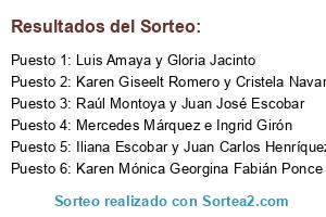 Lista de participantes: Karen Mónica Georgina Fabián Ponce, Luis Amaya y Gloria Jacinto, Mercedes Márquez e Ingrid Girón, Iliana Escobar y Juan Carlos Henríquez, Raúl Montoya y Juan José Escobar, Karen Giseelt Romero y Cristela Navarro.