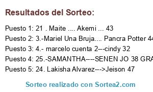 Lista de participantes: 1.- sar sarc...sar 60....graciass, 2.-Mariana Chacon-----MaRi 36, 3.-Mariel Una Bruja.... Pancra Potter 44, 4.- marcelo cuenta 2---cindy 32, 5.-maria gimeno airam......100, 6.- claudia georgina. ellen 60♥, 7.- Marisol Mrp...Mancha 43, 8.- mariana e unice, camino 42, 9.-Casanova renacuajo 52, 10. ESME BURELO BRONQUITA 45, 11-Steffi----Nessie 35, 12- Kayla Morrison // Luna 57, 13.PAOLA MARTI..PAOLITA 85, 14. Gab franme ------- 100, 15.Jesivak Torres....Jesi 92, 16.montse,chispita 39, 17. Zaida Caballero, Fosca 55, 18. Kar. Facebook 56, 19. analiz bolaños....azulina 58 (muchas gracias, tuve q borrar un post anterior xq postearon antes y despues q yo y tenia dos veces el numero repetido, perdon!!), 20. pato 100, 21 . Maite .... Akemi ... 43, 22...ANDRES....QUESO 100 XD, 23 Yolimar Yo2/ 61, 24. Lakisha Alvarez--->Jeison 47, 25.-SAMANTHA----SENEN JO 38 GRACIASSS, 26.- Gabi Torres....Allison 53, 27..Dayanara Lopez----Dayari 36♥, 28. Ildemary Perez..Ilde 35 gracias, 29 RENZO NARVAE---ENZO 36.
