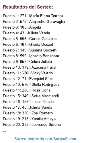 Lista de participantes: 1 Ana Sánchez , 2 Gustavo Martín , 3 Antonella Priou , 4 Hernán Gomez , 5 Marcela Di Gulio , 6 Mattia Panza , 7 Melisa Acosta , 8 Alejandra Bettera , 9 Marcela Di Gulio , 10 Melisa Schossow , 11 Rocío Carena , 12 Ana Sánchez , 13 Alejandra Bettera , 14 Liliana Arneodo , 15 Macarena Pardo , 16 Cecilia Andrada , 17 Cecilia Andrada , 18 Adriana Moyetta , 19 Adriana Moyetta , 20 Marina Almeida , 21 Melina Promanzio , 22 María José Berdullo , 23 Sofía Serafini , 24 Andrea Florena , 25 Melina Promanzio , 26 Marianella Alfaro , 27 María José Berdullo , 28 Andrea Grazini , 29 Julia Junquera , 30 Enrique Depetris , 31 Silvia Sereno , 32 Silvia Sereno , 33 Guadalupe Fernández , 34 Silvia Sereno , 35 Ruli Amati , 36 Silvia Sereno , 37 Guadalupe Fernández , 38 Julieta Varela , 39 Silvia Sereno , 40 Ruli Amati , 41 Ruli Amati , 42 Ruli Amati , 43 Julieta Varela , 44 Ruli Amati , 45 Julieta Varela , 46 Pablo Titarelli , 47 Ezequiel Marcle , 48 Vale Torres , 49 Mati Maldonado , 50 Santiago Armitano , 51 Camila Corradi , 52 Luz Irastorza , 53 Lucia Gonella , 54 Manu Bustos , 55 Ezequiel Marcle , 56 Magalí Cepero , 57 Elian Jalit , 58 Naara Guzmán , 59 Mariano Llobel , 60 Gonella , 61 Carolina Castillo , 62 Virginia Scala , 63 Marianela Baez , 64 Susana Alvarez , 65 Julián Galván , 66 Nancy Pitattore , 67 Daniel Peralta , 68 Marianela Baez , 69 Ezequiel Sitko , 70 Pamela Ortiz , 71 Ezequiel Sitko , 72 María Elena , 73 Julián Galván , 74 Julián Galván , 75 Ruth Sassaroli , 76 Rocío Quiñones , 77 Francisco Mazufri , 78 Lucas Aguirre , 79 Soledad Mussolini , 80 Soledad Mussolini , 81 Dora Bersezio , 82 Dora Bersezio , 83 Dora Bersezio , 84 Dora Bersezio , 85 Dora Bersezio , 86 Franco Lisa , 87 Franco Lisa , 88 Franco Lisa , 89 Sofía Acosta , 90 Sofía Acosta , 91 Gabriela Paruzzo , 92 Gabriela Paruzzo , 93 Lucía Paruzzo , 94 Lucía Paruzzo , 95 Nicolás Gómez , 96 Fabrizio Pérez , 97 Milagros Oddi , 98 Ignacio César , 99 Nicolás Gómez , 100 Nicolás Gómez , 101 Branco García , 102 Paulina Monge , 103 Hugo Aguilar , 104 Nicolás Gómez , 105 Celina Fernández , 106 Stella Ravagnani , 107 Cecilia Oviedo , 108 Virginia Casero , 109 Gabriel Gariglio , 110 Paulina Manchado , 111 Cecilia Oviedo , 112 Magalí Junco , 113 Ana Paula Barroso , 114 Agostina Cejas , 115 Ana Paula Barroso , 116 Milagros Pereyra , 117 Cecilia Oviedo , 118 Bruno Baldocchi , 119 Gabriel Gariglio , 120 Virginia Casero , 121 Mariela Rotelli , 122 Carla Fernandez , 123 Vanina Dominguez , 124 Soledad Godoy Tuset , 125 Yamile Gonzalez , 126 Mabel Salazar Lotto , 127 Mabel Salazar Lotto , 128 Carla Fernandez , 129 Mabel Salazar Lotto , 130 Liliana Formento , 131 Noelia (Ayudante historia) , 132 Nico Beltramino , 133 Sofia Galetto , 134 Lorenzo Roberti , 135 Lorenzo Roberti , 140 cristina medina , 143 Silvina Barroso , 144 silvina Barroso , 145 Cristian SAntos , 146 cristian SAntos , 147 Carla Borghi , 148 Sebastian Lasa , 149 Susana Sposetti , 150 Ana Lia Lasa , 151 Maria Belen Lasa , 152 Cristina Giacobone , 153 Marcos Altamirano , 154 Elena Berruti , 155 Anahí Asquineyer , 156 Noelia Albano , 157 Lucas Toledo , 158 Loly Alberioz , 159 Lucas Toledo , 160 Nicolas Lopez , 161 Anabel Lopez , 162 Carla Algeri , 163 Soledad Vignetta , 164 Lucas Toledo , 165 Carla Algeri , 166 Tamara Cepeda Cáceres , 167 Noelia Albano , 168 Carolina Albano , 169 Florencia Lopez , 170 Loly Alberioz , 171 Fabiana Biassi , 172 Fabiana Biassi , 173 Fabiana Biassi , 174 Fabiana Biassi , 175 Fabiana Biassi , 176 Azucena Farah , 177 Azucena Farah , 178 Azucena Farah , 179 Azucena Farah , 180 Azucena Farah , 181 Alfonso Amati , 182 Alfonso Amati , 183 Alfonso Amati , 184 Ángela , 185 Ángela , 186 Ángela , 187 Gisela Doszel , 188 Gisela Doszel , 189 Gisela Doszel , 190 Agustina Calderón , 191 Clara Demarchi , 192 Sergio Ravagnani , 193 Clara Demarchi , 194 Lautaro Ravagnani , 195 Facundo Etchebar , 196 Sonia Dillon , 197 Florencia Compagnucci , 198 Lautaro Ravagnani , 199 Sonia Dillon , 200 Sergio Ravagnani , 201 Viviana Ferrero , 202 Vicky Valerio , 203 Susana Cormick , 204 Susana Cormick , 205 Vicky Valerio , 206 Lorena , 207 Adriana Kunz , 208 Diego Dadone , 209 Marlene , 210 Marlene , 211 Mirna Estigarribia , 212 Martin Toledo , 213 Josefina Toledo , 214 Aldana Mora , 215 Yamila Amaya , 216 Maria Elena Acosta , 217 Gonzalo Toledo , 218 Melisa Albano , 219 Analia Romero , 220 Melisa Albano , 221 Pablo Varela , 222 Lucía Amati , 223 Pablo Varela , 224 Pablo Varela , 225 Pablo Varela , 226 Pablo Varela , 227 Pablo Varela , 228 Pablo Varela , 229 Pablo Varela , 230 Pablo Varela , 231 Alicia Pico , 232 Abril Freytes , 233 Griselda Barberis , 234 Lidia Freytes , 235 Virginia Rodriguez , 236 Mary Oviedo , 237 Martha Oviedo , 238 Yara Quiroga , 239 Alicia Vélez , 240 Silvia Pereyra , 241 Jaqueline Moreno , 242 Facundo Pérez , 243 Norma Oviedo , 244 Griselda Barberis , 245 Alicia Freytes , 246 Bárbara Quiroga , 247 Esmeralda Oviedo , 248 Carnicería "Los Amigos" , 249 Ariana Pauluci , 250 Veronica Conti , 251 Sergio Ravagnani , 252 Sonia Dillon , 253 Florencia Compagnucci , 254 Facundo Etchebar , 255 Romina Bonacci , 256 Viviana Ferrero , 257 Sonia del Fraine , 258 Viviana Ferrero , 259 Silvia Ferrero , 260 Silvia Ferrero , 261 Vicky Valerio , 262 Diego Ferrero , 263 Susana Rolotti , 264 Maqui Ríos , 265 Maqui Ríos , 266 Susana Rolotti , 267 Maqui Ríos , 268 Susana Rolotti , 269 Ana Lucía Tartaggia , 270 Ana Lucía Tartaggia , 271 María Elena Torreta , 272 Valeria Gualtieri , 273 Virginia Olivo , 274 Valeria Gualtieri , 275 Virginia Olivo , 276 Rosa Coria , 277 Valeria Gualtieri , 278 Valeria Gualtieri , 279 Valeria Gualtieri , 280 Rosa Coria , 281 Sulamita Moreno , 282 Sofía Varela , 283 Carla Suárez , 284 Carla Suárez , 285 Carla Suárez , 286 Emilia Delgado , 287 Emilia Delgado , 288 Emilia Delgado , 289 Emilia Delgado , 290 Emilia Delgado , 309 Fanny Fernández , 310 Eugenia Prieto , 311 Fanny Fernández