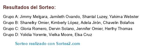 Lista de participantes: Chavelin Bolaños, Vielka Moore, Herthy Thomas, Jimmy Melgara, Yolidia Yorente, Jamileth Ovando, Dervin Solano, Elsa Cruz, Yakima Webster, Adela Jirón, Shanelky Omier, Shantal Luzey, Gloria Romero, Jennifer Omier, Kimberly López.