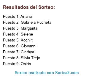 Lista de participantes: Ariana, Giovanni, Osiris, Margarita, Xochilt, Selene, Cinthya, Gabriela Pucheta, Silvia Trejo.