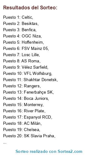 Lista de participantes: AC Milán,, AS Roma,, Benfica,, Besiktas,, Boca Juniors,, Celtic,, Chelsea,, Espanyol RCD,, Fenerbahçe SK,, FSV Mainz 05,, Hoffenheim,, Losc Lille,, Monterrey,, OGC Niza,, Porto,, PSV,, Rangers,, RB Leipzig,, River Plate,, Shakhtar Donetsk,, SK Slavia Praha,, Southampton,, Vélez Sarfield,, VFL Wolfsburg,.