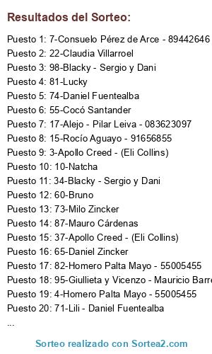 Lista de participantes: 1-Consuelo Pérez de Arce - 89442646, 2- Tiliberto Berrios Sepulveda- 91629163, 3-Apollo Creed - (Eli Collins), 4-Homero Palta Mayo - 55005455, 5-Rocío Aguayo - 91656855, 6-Milo Zincker, 7-Consuelo Pérez de Arce - 89442646, 8-Macarena Araya - 75873451, 9-Natcha, 10-Natcha, 11-Constanza González - 74063163, 12-Completo - 82508378, 13-Alejo - Pilar Leiva - 083623097, 14-Constanza González - 74063163, 15-Rocío Aguayo - 91656855, 16-Leonor - (Eli Collins), 17-Alejo - Pilar Leiva - 083623097, 18-Apollo Creed - (Eli Collins), 19-Macarena Araya - 75873451, 20-Martina y Lucho, 21-Pelusa Ocampo, 22-Claudia Villarroel, 23-Completo - 82508378, 24-Consuelo Pérez de Arce - 89442646, 25-Rafaela, 26-Josefina, 27-Karina Vivencio - 95191113, 28-Claudia Villarroel, 29-Completo - 82508378, 30-Pelusa Ocampo, 31-Leonor - (Eli Collins), 32-Pamela Villanueva, 33-Giullieta y Vicenzo - Mauricio Barrera, 34-Blacky - Sergio y Dani, 35-Giullieta y Vicenzo - Mauricio Barrera, 36-Giullieta y Vicenzo - Mauricio Barrera, 37-Apollo Creed - (Eli Collins), 38-Octavio, 39-Giullieta y Vicenzo - Mauricio Barrera, 40-Leonor - (Eli Collins), 42-Homero Palta Mayo - 55005455, 43-Blacky - Sergio y Dani, 44-Daniel Zincker, 45-Luna - Tania Lara 63037335, 47-Apollo Creed - (Eli Collins), 49-Leonor - (Eli Collins), 50-Giullieta y Vicenzo - Mauricio Barrera, 51-Bruno, 53-Macarena Zúñiga - Emma, 55-Cocó Santander, 57-Alberto Edwards, 60-Bruno, 62-Pupi - Tania Lara 634037335, 63-Giullieta y Vicenzo - Mauricio Barrera, 64-Blacky - Sergio y Dani, 65-Daniel Zincker, 66-Giullieta y Vicenzo - Mauricio Barrera, 67-Homero Palta Mayo - 55005455, 69-Lucho, 70-Giullieta y Vicenzo - Mauricio Barrera, 71-Lili - Daniel Fuentealba, 72-Nina- Daniel Fuentealba, 73-Milo Zincker, 74-Daniel Fuentealba, 75-Remi- Daniel Fuentealba, 76-Suco- Daniel Fuentealba, 77-Bruno, 79-Luna Guasp, 80-Lucho, 81-Lucky, 82-Homero Palta Mayo - 55005455, 83-Consuelo Pérez de Arce - 89442646, 84-Homero Palta Mayo - 55005455, 85-Macarena Zúñiga - Emma, 86-Homero Palta Mayo - 55005455, 87-Mauro Cárdenas, 88-Pamela Villanueva, 90-Octavio, 91-Lucho, 92-Toffy Guasp, 93-Bruno, 95-Giullieta y Vicenzo - Mauricio Barrera, 96-Cocó Santander, 97-Giullieta y Vicenzo - Mauricio Barrera, 98-Blacky - Sergio y Dani, 99-Giullieta y Vicenzo - Mauricio Barrera, 100-Karina Vivencio - 95191113.