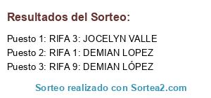 Lista de participantes: RIFA 1: DEMIAN LOPEZ, RIFA 2: GLORIA LOPEZ, RIFA 3: JOCELYN VALLE, RIFA 4: DEMIAN LOPEZ, RIFA 5: NAZLO ASENJO, RIFA 6: GLORIA LÓPEZ, RIFA 7: JOCELYN VALLE, RIFA 8: JOCELYN VALLE, RIFA 9: DEMIAN LÓPEZ, RIFA 10: DEMIAN LOPEZ.