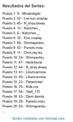 Lista de participantes: 1- Chris.rey.re, 2- Feer.beleen_, 3- Katzchen._, 4- Len.kun.cosplay, 5- Katzchen._, 6- Anyahigure, 7- Bak.kugouu, 8- Kide.cos, 9- Minakologist, 10- Benja.uzumakii, 11- Chris,rey.rey, 12- Katzchen._, 13- Bak.kugouu, 14- Taibanibani, 15- Mitsu_.ki, 16- Shiimapantsu, 17- Somiuniversefactor, 18- Penwinrawr, 19- J.ava.psaez, 20- Kingofhell.exe, 21- _.mylittlebunny, 22- Penwinrawr, 23- Harikitsune, 24- Shiimpantsu, 25- Kide.cos, 26- Katzchen._, 27- Shiimapantsu, 28- Pansito.miau, 29- Shiimapantsu, 30- Curepansy, 31- Len.kun.cosplay, 32- Eire.cosplay, 33- _buiikikaesu, 34- Kingofhell.exe, 35- Shiimapantsu, 36- Plascaltlaca, 37- Anyahigure, 38- Liliumcarmine, 39- Liliumcarmine, 40- Liliumcarmine, 41- Liliumcarmine, 42- Pansito.miau, 43- Liliumcarmine, 44- R_stray.sheep, 45- R_stray.sheep, 46- Eire.cosplay, 47- Harikitsune, 48- Shiimapantsu, 49- _buiikikaesu, 50- Len.kun.cosplay, 51- Acuarinapiernaslargas, 52- Len.kun.cosplay, 53- Dami.damita, 54- Acuarinapiernaslargas, 55- Shiimapantsu, 56- Teefi_131, 57- Teefi_131, 58- Shiimapantsu, 59- Plascaltlaca, 60- Teefi_131.