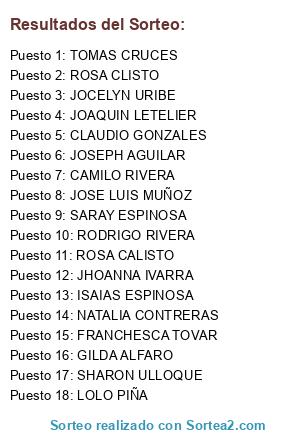Lista de participantes: LESLY MARILLAN, LESLY MARILLAN, ROCIO CONTRERAS, ROSA CALISTO, ROSA CLISTO, PAULA DAYNE, ROSA CALISTO, JOAQUIN LETELIER, ISAIAS ESPINOSA, JOSEPH AGUILAR, JOAQUIN LETELIER, JOAQUIN LETELIER, RODRIGO RIVERA, PAULA DAYNE, PAULA DAYNE, PAULA DAYNE, PAULA DAYNE, GERALDINE LIZAMA, JOSE HURTADO, JOSEPH AGUILAR, DANIELA CARCAMO, DANIELA CARCAMO, DANIELA CARCAMO, TOMAS CRUCES, CAMILO RIVERA, ALEJANDRA CONTRERAS, SANDRA ANTONIETTI, JOSEPH AGUILAR, NATALIA CONTRERAS, JOSEPH AGUILAR, NANNY TIRADO, CAMILO RIVERA, DARICEL URDANETA, JOAQUIN LETELIER, SHARON ULLOQUE, SHARON ULLOQUE, FRANCHESCA TOVAR, FRANCHESCA TOVAR, CAMILO RIVERA, SHARON ULLOQUE, FRANCHESCA TOVAR, YURI PIÑA, FABIAN REBOLLEDO, JOSEPH AGUILAR, LOLO PIÑA, JHOANNA IVARRA, YURI PIÑA, SARAY ESPINOSA, JOAQUIN LETELIER, PAULINA LIENDO, CLAUDIO GONZALES, CLAUDIO GONZALES, CLAUDIO GONZALES, CLAUDIO GONZALES, CLAUDIO GONZALES, CAMILO RIVERA, ELISEO ESPINOSA, GILDA ALFARO, LUIS ARRIAGADA, JOCELYN URIBE, ROSA CALISTO, SARAY ESPINOSA, MARILYN ARTEAGA, PAULINA LIENDO, JOSE LUIS MUÑOZ, MARILYN ARTEAGA, PAULINA LIENDO, CAMILO RIVERA, JOSE LUIS MUÑOZ.