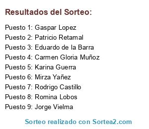 Lista de participantes: Denisse Gonzalez, Eduardo de la Barra, Karina Guerra, Boris Jimenez, Jessica Mendez, Claudia Machulas, Denisse Gonzalez, Eduardo de la Barra, Boris Jimenez, Karina Guerra, Nathali Caceres, Gaspar Lopez, Eduardo de la Barra, Jaime Moraguez, Boris Jimenez, Rosangela Sarno, Fernando Heredia, Anibal Pacheco, Evelyn Ramirez, Francisco Pizarro, Jorge Guzman, Fernando Heredia, Claudio Muñoz, Olaya Medina, Olaya Medina, Felipe Rivera, Felipe Rivera, Felipe Zapata, Patricio Retamal, Boris Jimenez, Williams Ponce de Leon, Jorge Guzman, Francisco Pizarro, Diego Heredia, Christian Ramirez, Humberto Martin, Patricio Retamal, Valeria Barraza, Rodrigo Valenzuela, Carlos Aguilera, Rodrigo Valenzuela, Pablo Lagos, Rafaela Hidalgo, Carlos Aguilera, Dina Olave, Trinidad Hidalgo, Carla Contreras, Marcela Gaete, Isabel Diaz, Isabel Diaz, Nibaldo Navarrete, Karina Guerra, Luis Henriquez, Humberto Martin, Dina Olave, Felipe Zapata, Luis Henriquez, Luis Henriquez, Carlos Aguilera, Rodrigo Yunge, Carlos Asenjo, Carlos Asenjo, Rodrigo Castillo, Mario Alvarez, Felipe Leyton, Carlos Aguilera, Veronica Farias, Marcela Gaete, Claudio Muñoz, Veronica Farias, Carmen Gloria Muñoz, Oscar Palma, Soledad Hernandez, Valeria Barraza, Mirza Yañez, Carmen Gloria Muñoz, Nibaldo Navarrete, Soledad Hernandez, Elena Hidalgo, Rodrigo Castillo, Oscar Palma, Talia Vilches, Rodrigo Yunge, Jorge Vielma, Javier Roman, Marcela Gaete, Gonzalo Flores, Pablo Iturra, Cristian Mendez, Romina Lobos, Romina Lobos, Romina Lobos, Romina Lobos, Andres Molina, Andres Molina, Humberto Martin, Carla Contreras, Nathali Caceres, Eduardo Diaz, Gaspar Lopez.