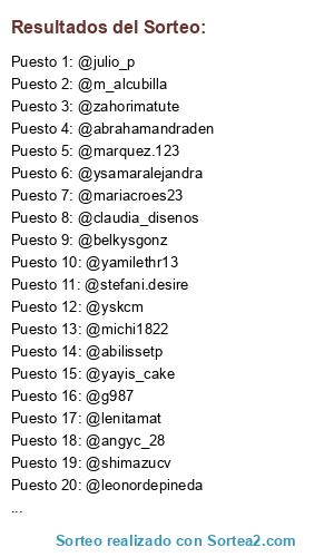 Lista de participantes: @abilissetp, @yayis_cake, @claudia_disenos (4 participaciones), @julio_p, @yskcm (4 participaciones), @mavalentinamb, @leonordepineda, @belkysgonz (3 participaciones), @m_alcubilla (15 participaciones), @yamilethr13, @valeriaapitz1301, @deokiegm (2 participaciones), @mduenas, @stefani.desire, @lenitamat (2 participaciones), @zahorimatute, @jormarquez (2 participaciones), @abrahamandraden, @andycobo242130, @michi1822, @mariangove (2 participaciones), @patrijv, @juliojreyes, @mariacroes23 (3 participaciones), @g987, @angyc_28, @eukalezama, @andmar30, @shimazucv, @ysamaralejandra, @marquez.123.